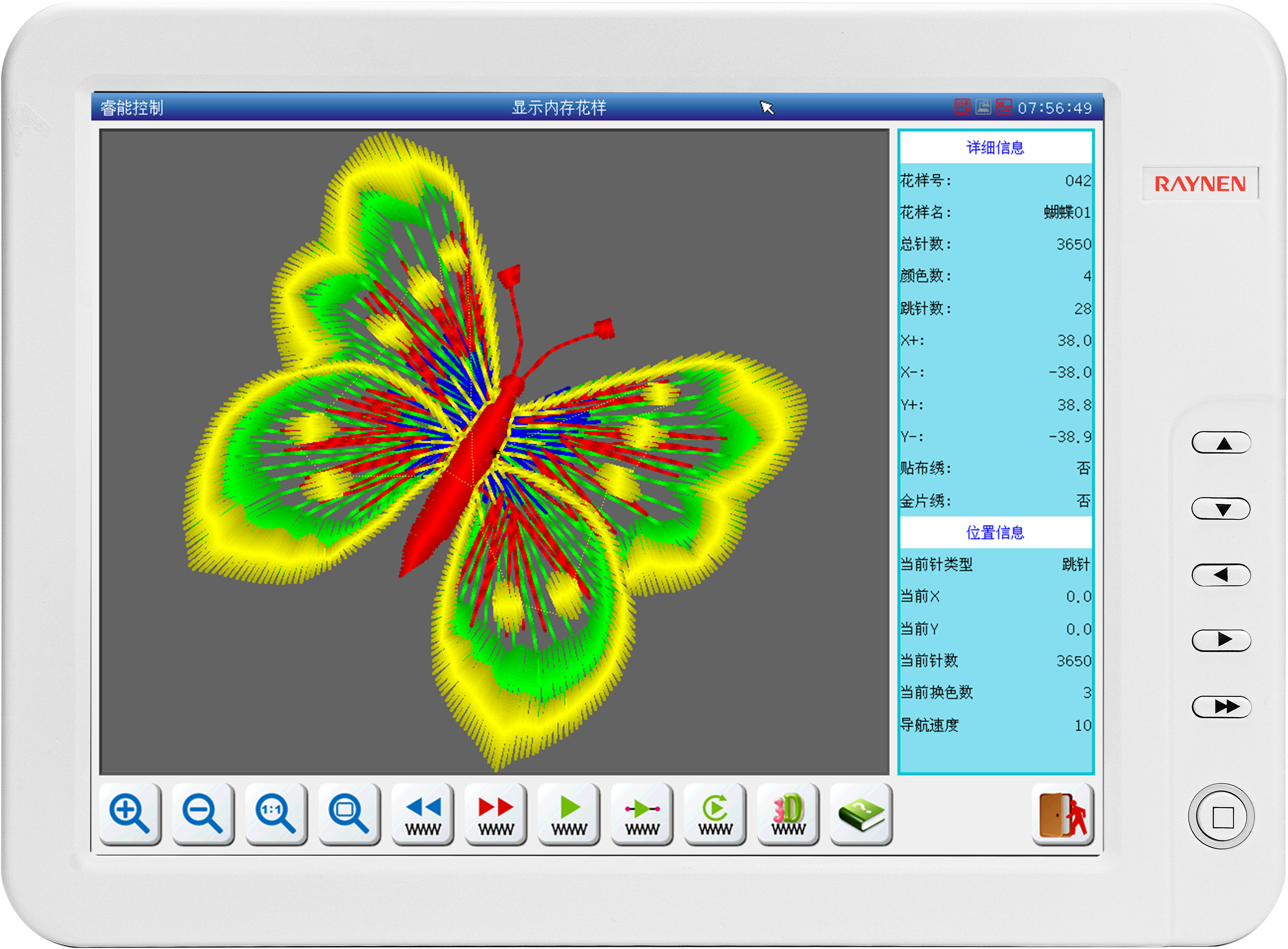 RM系列多頭毛巾繡是屬于一種立體的多工藝刺繡,電控系統通過毛巾主軸M,XY平面框架、D針方向軸、H環梭軸、S松線軸及T換色軸的6-7個軸綜合控制的數字控制系統來完成各種各樣花版圖形的鏈式毛巾繡作。在服裝皮革鞋帽等面料上產生出花樣絢麗、立體感強、邊角清晰的繡品。該產品系統嵌入了多種精密加工技術,包括:運動軌跡的跟蹤與控制,花版的綜合顯示管理與預處理,系統多信息融合的協調控制,各種機械部件的優化驅動,管控一體化的調度等。