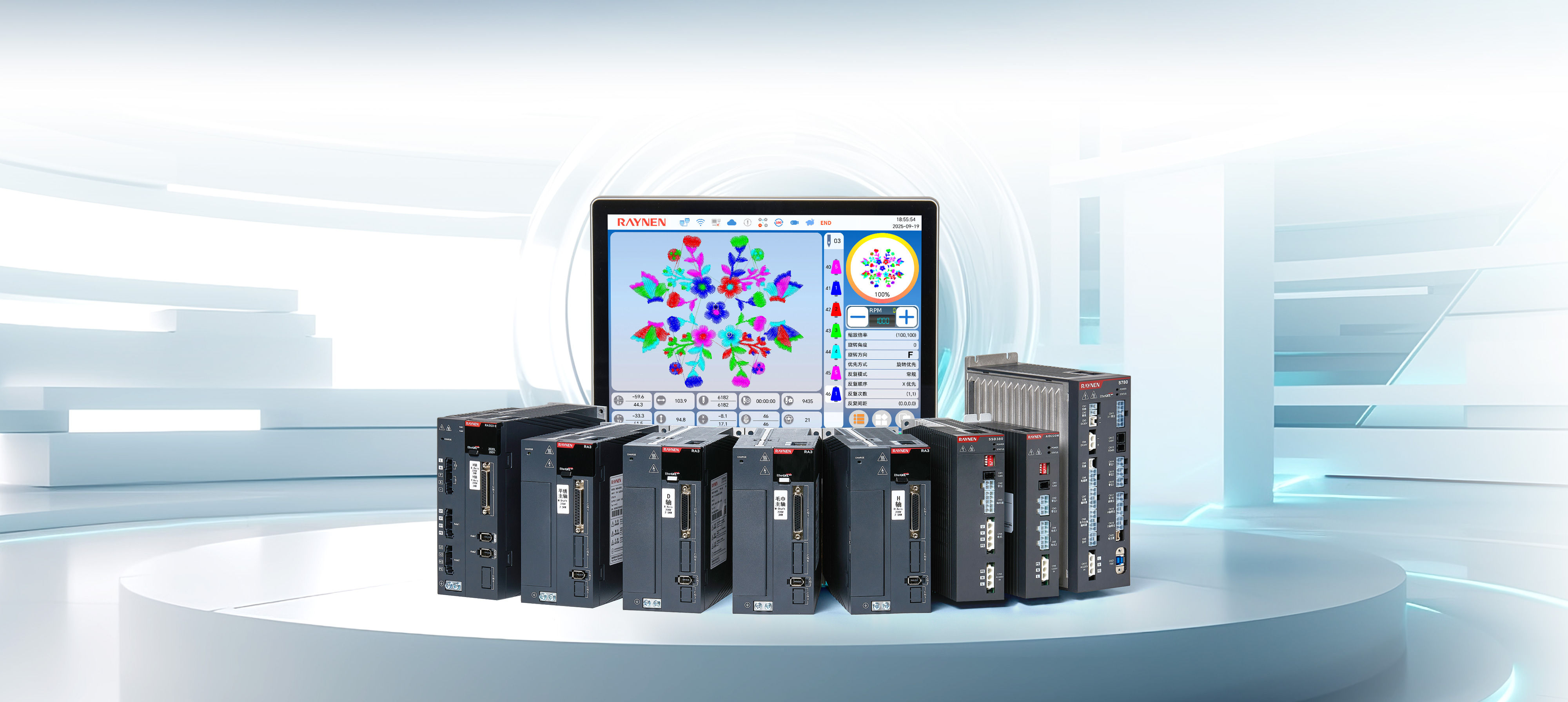S700系列刺繡機電控系統通過緊湊的機身設計、標準化部件應用,提升了空間利用率和設備維護便捷性,降低了運營成本。其無線操作屏、高精度絕對值編碼器伺服控制系統、全新通用專機伺服等技術創新,不僅提高了生產效率和產品質量,還通過移框智能防夾設計、安全光幕和高清顯示屏增強了設備的安全性和操作性。同時,配置了智慧工廠網絡管理接口,實現了設備的遠程智能化管理,并在精度控制上達到行業領先水平。