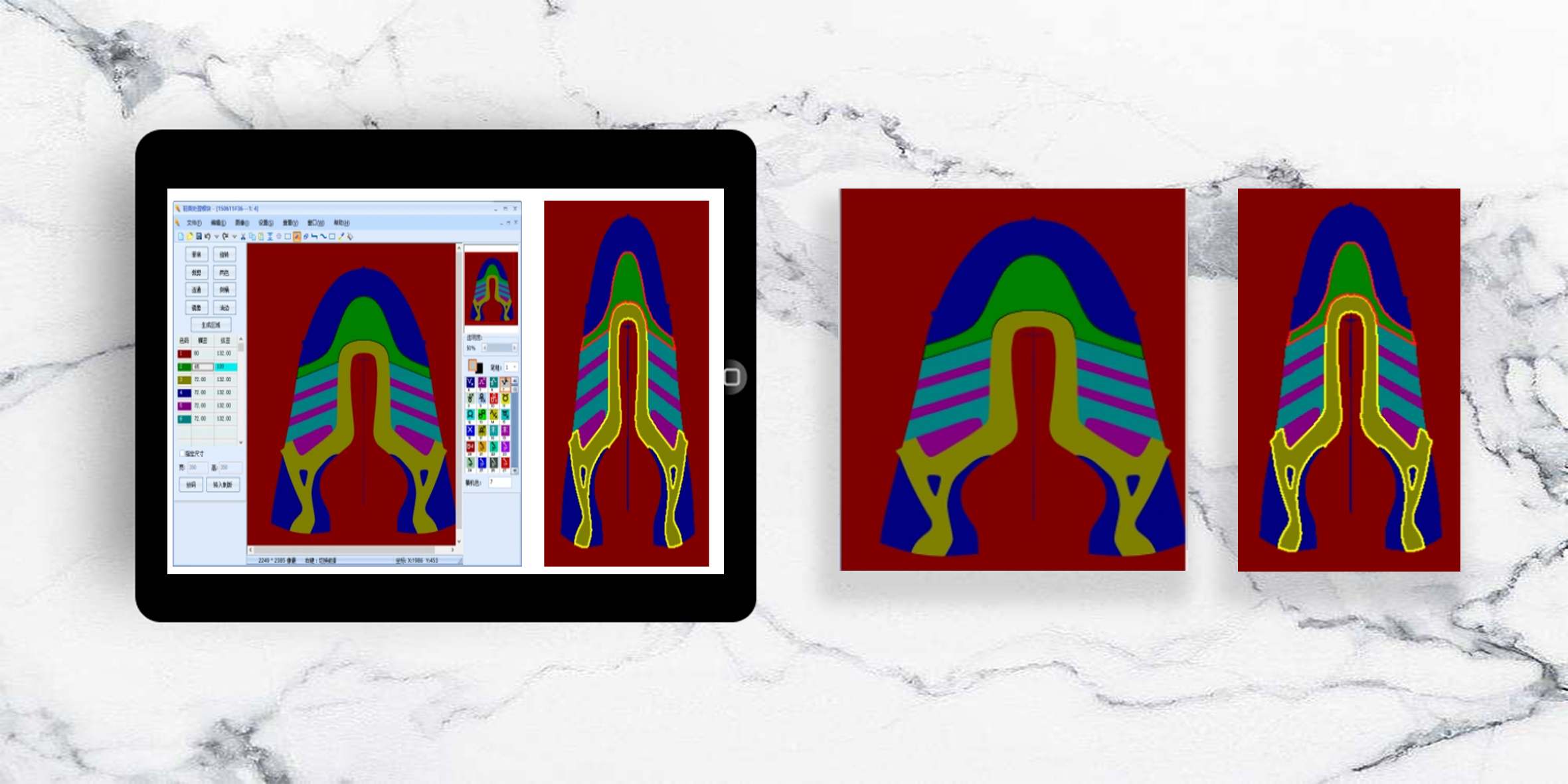 自動識別鞋面菲林稿不規則花紋的輪廓,不同區域可定義不同密度,避免編織后花樣變形